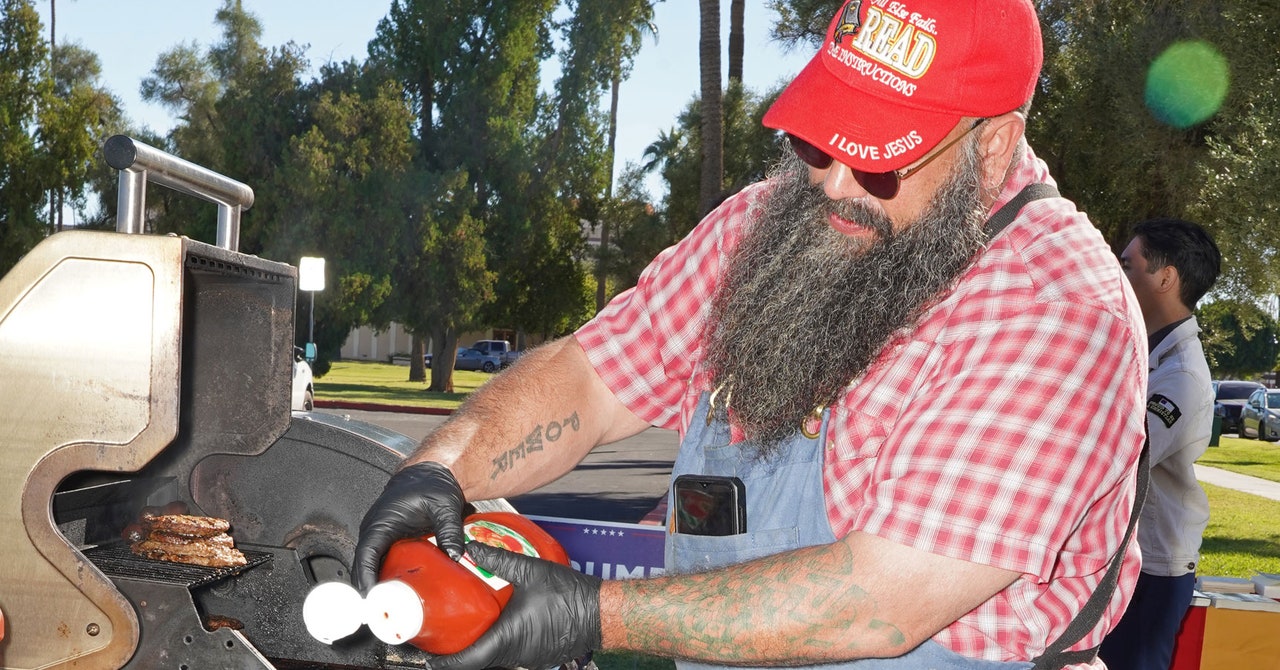 Mesa, AZ — A group of America First groypers, college Republicans, and a Christian nationalist pastor were handing out burgers and hot dogs to voters in Phoenix on Tuesday—but only if they voted for former president Donald Trump.